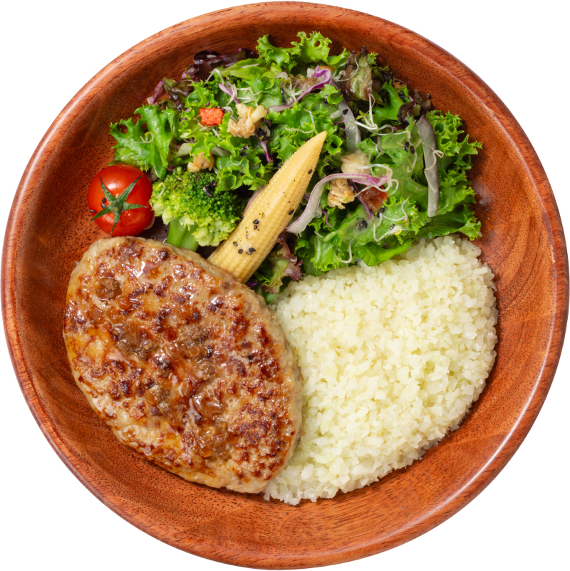 お米からカリフラワーライスに変えれば炭水化物はおよそ1/12※! チキントッピング、パティ増量もオススメ!